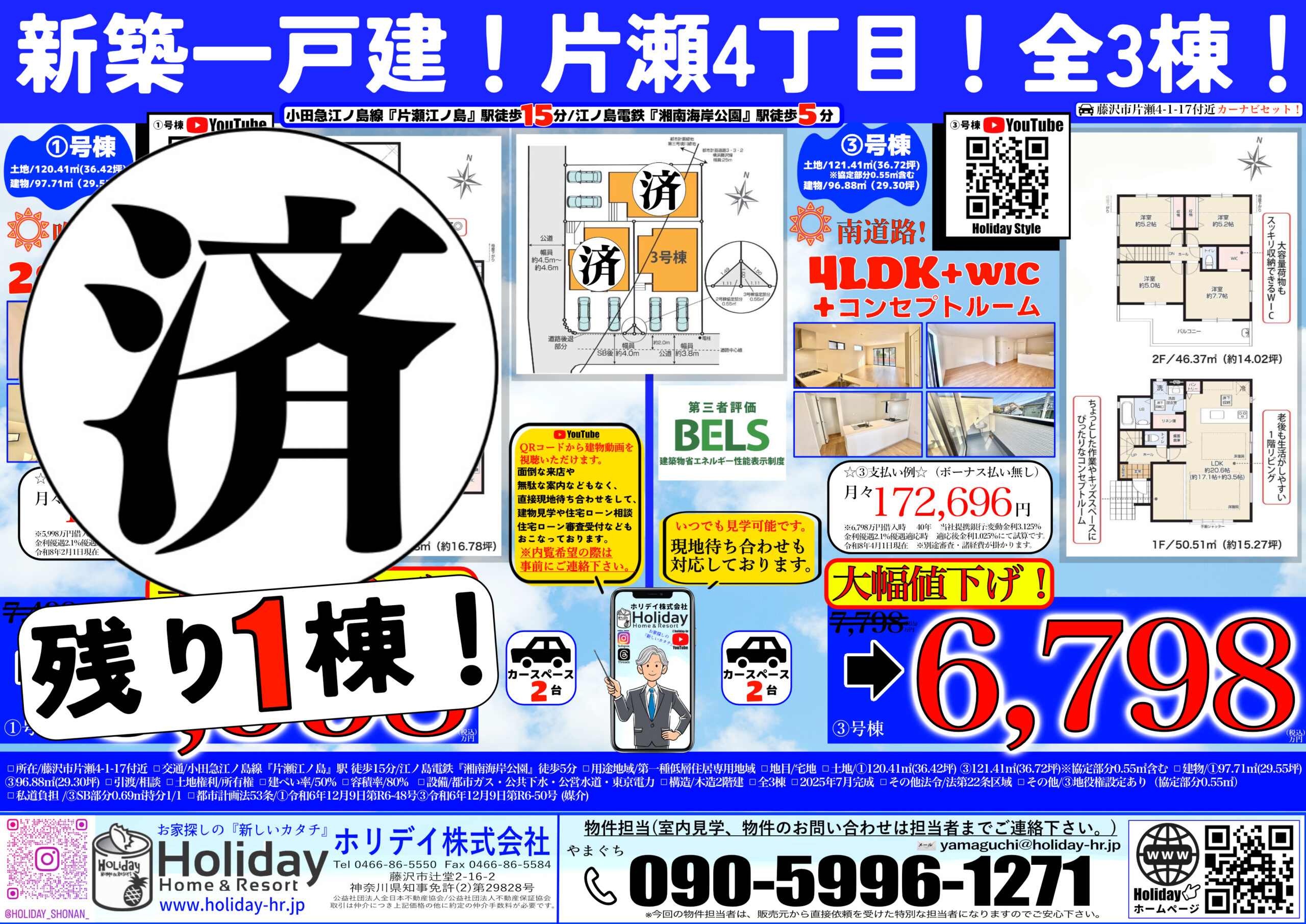 【価格変更】新築一戸建 全3棟 残り1棟 藤沢市片瀬4丁目 カースペース2台以上 「湘南海岸公園」駅徒歩5分!【3号棟】7,248万円→6,798万円! 4月 19, 2026 - 価格変更! 【3号棟】7,248万円→6,798万円