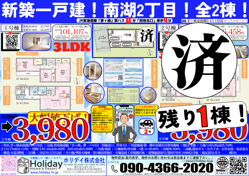 新築一戸建 全2棟 残り1棟 茅ヶ崎市南湖2丁目 前面道路約6.7m