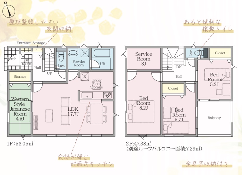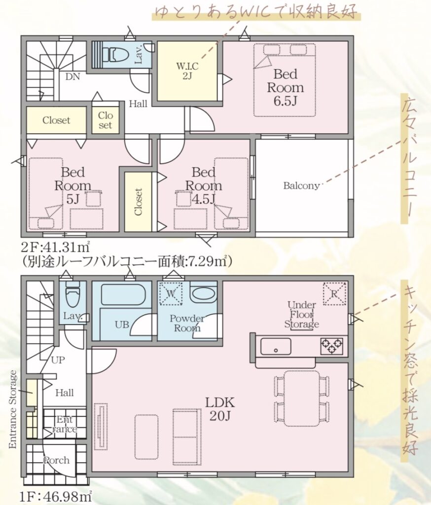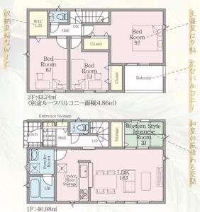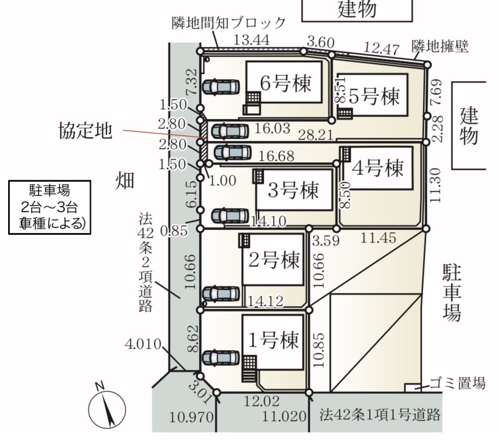 | 土地面積 | ①150.46㎡(45.51坪) ②150.49㎡(45.52坪)③150.50㎡(45.52坪) ④179.49㎡(54.29坪) ⑤178.30㎡(53.93坪) ⑥150.48㎡(45.52坪) | 建物面積 | ①103.68㎡(31.36坪) ②100.43㎡(30.38坪)③95.58㎡(28.91坪) ④90.72㎡(27.44坪) ⑤88.29㎡(26.70坪) ⑥94.77㎡(28.66坪) |