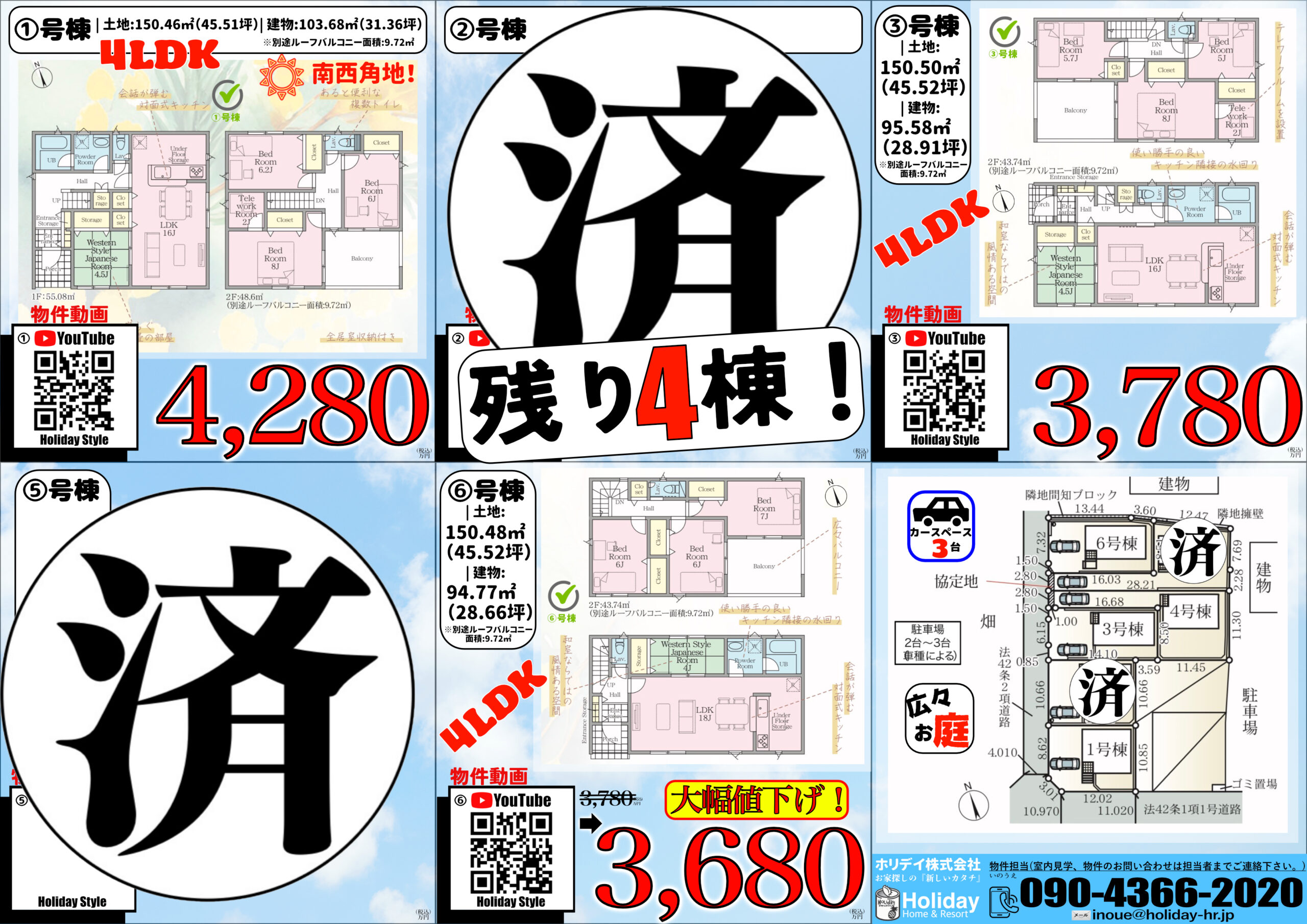 【動画】全6棟!2号棟・再販売!!建物堂々完成!いつでも見学可能です。現地待ち合わせも対応しております。全棟45坪以上!カースペース3台。3LDK~4SLDK!広々お庭♪