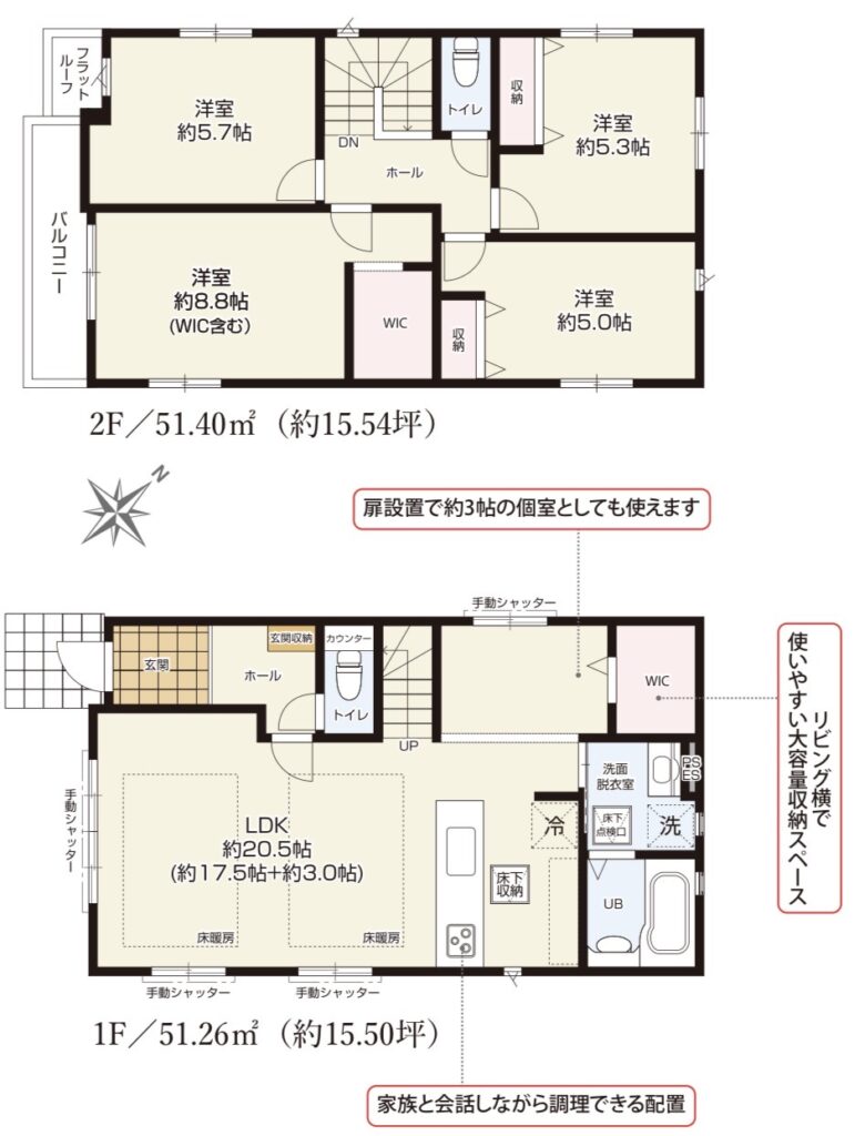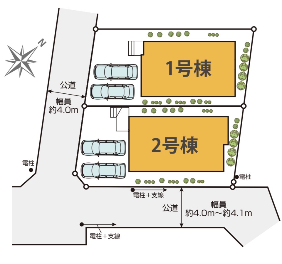 | 土地面積 | ①128.75㎡(38.94坪 ②134.75㎡(40.76坪) | 建物面積 | ①102.66㎡(31.05坪) ②106.96㎡(32.35坪) |